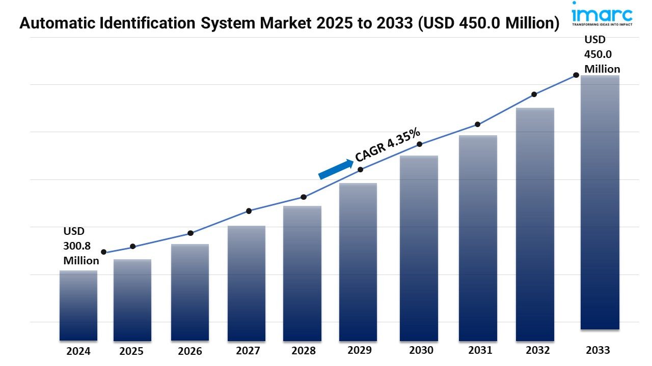The Automatic Identification System Market is experiencing steady expansion, driven by Mandatory Regulatory Requirements, Collision Avoidance and Navigation Enhancement and Growing Maritime Trade. According to IMARC Group's latest research publication, "Automatic Identification System Market: Global Industry Trends, Share, Size, Growth, Opportunity and Forecast 2025–2033", The global automatic identification system market size reached USD 300.8 Million in 2024. Looking forward, IMARC Group expects the market to reach USD 450.0 Million by 2033, exhibiting a growth rate (CAGR) of 4.35% during 2025-2033.